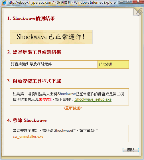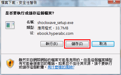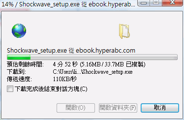 在下載完成後於您所儲存的位置,點選「shockwave_setup.exe」程式會自動解壓縮並進行系統偵測。  |