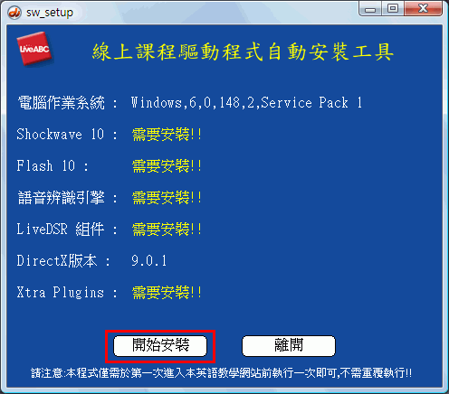 在解壓縮後,程式會顯示該電腦安裝元件的狀態,若有任何一項顯示「需要安裝」,